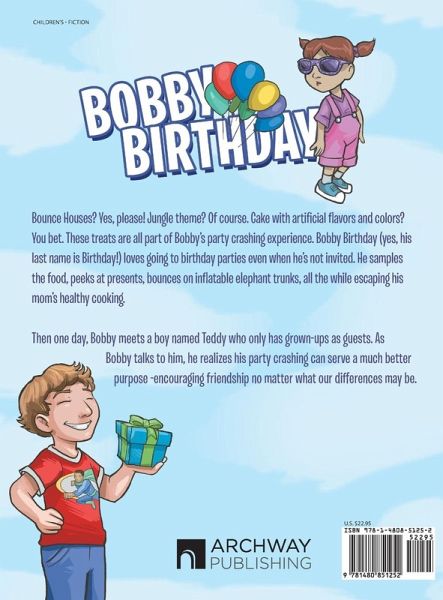 Bounce Houses? Yes, please! Jungle theme? Of course. Cake with artificial flavors and colors? You bet. These treats are all part of Bobby's party crashing experience. Bobby Birthday (yes, his last name is Birthday!) loves going to birthday parties even when he's not invited. He samples the food, peeks at presents, bounces on inflatable elephant trunks, all the while escaping his mom's healthy cooking. Then one day, Bobby meets a boy named Teddy who only has grown-ups as guests. As Bobby talks to him, he realizes his party crashing can serve a much better purpose -encouraging friendship no matter what our differences may be.