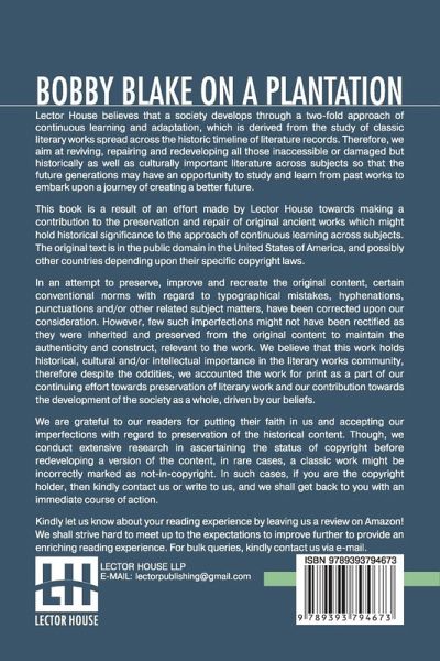 NEW PRINT WITH PROFESSIONAL TYPE-SET IN CONTRAST TO SCANNED PRINTS OFFERED BY OTHERS Bobby Blake On A Plantation: Or Lost In The Great Swamp This book is a result of an effort made by us towards making a contribution to the preservation and repair of original classic literature. In an attempt to preserve, improve and recreate the original content, we have worked towards: 1. Type-setting & Reformatting: The complete work has been re-designed via professional layout, formatting and type-setting tools to re-create the same edition with rich typography, graphics, high quality images, and table elements, giving our readers the feel of holding a 'fresh and newly' reprinted and/or revised edition, as opposed to other scanned & printed (Optical Character Recognition - OCR) reproductions. 2. Correction of imperfections: As the work was re-created from the scratch, therefore, it was vetted to rectify certain conventional norms with regard to typographical mistakes, hyphenations, punctuations, blurred images, missing content/pages, and/or other related subject matters, upon our consideration. Every attempt was made to rectify the imperfections related to omitted constructs in the original edition via other references. However, a few of such imperfections which could not be rectified due to intentional\unintentional omission of content in the original edition, were inherited and preserved from the original work to maintain the authenticity and construct, relevant to the work. We believe that this work holds historical, cultural and/or intellectual importance in the literary works community, therefore despite the oddities, we accounted the work for print as a part of our continuing effort towards preservation of literary work and our contribution towards the development of the society as a whole, driven by our beliefs. We are grateful to our readers for putting their faith in us and accepting our imperfections with regard to preservation of the historical content. HAPPY READING!