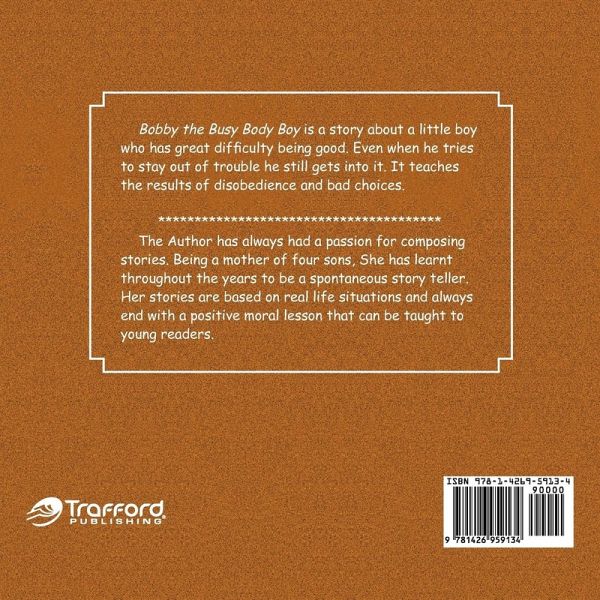 Bobby the Busy Body Boy is a story about a little boy who has great difficulty being good. Even when he tries to stay out of trouble he still gets into it. It teaches the results of disobedience and bad choices.