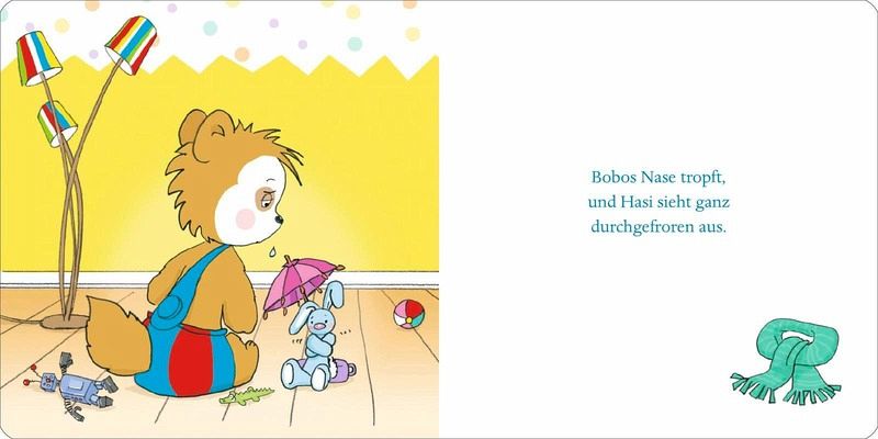 Bobo und Hasi geht es heute aber gar nicht gut - der Bauch tut weh, und sie fühlen sich ganz schlapp. Da bleiben sie lieber im Bett. Eine Wärmflasche tut gut. Und gekochte Mohrrüben schmecken beiden. Schließlich ist das Bauchweh vorbei, hurra!