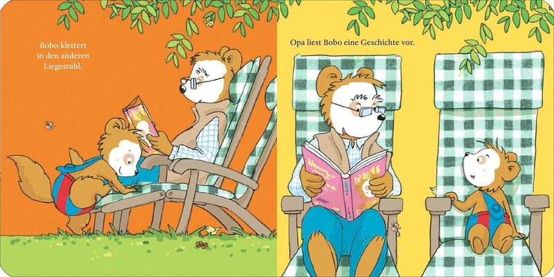 Bobo besucht seine Großeltern in ihrem Garten. Er pflückt Kirschen, hilft beim Blumen gießen, fährt mit dem Dreirad und lässt sich von Opa etwas vorlesen. Im Liegestuhl schläft er ein. Was für ein fröhlicher Tag!