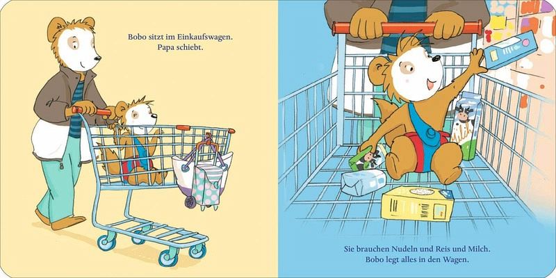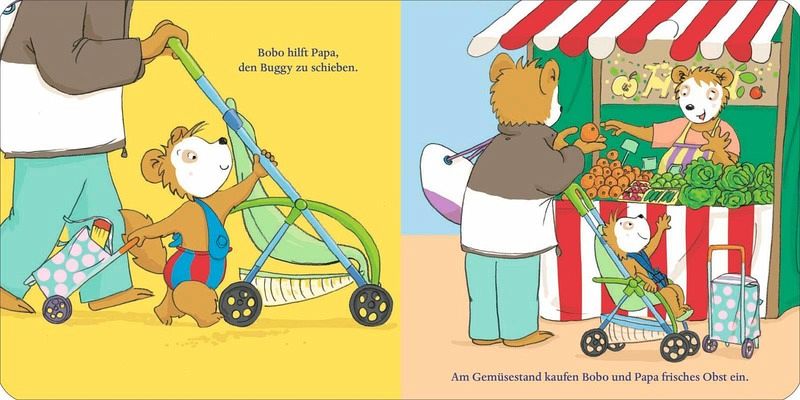 Bobo geht mit Papa einkaufen. Erst in den Supermarkt, dann auf den Markt. Auf einem Schaukelelefant darf Bobo reiten. Papa kauft ihm noch ein Heft am Kiosk. Auf dem Heimweg schläft Bobo im Buggy ein. Was für ein aufregender Tag!