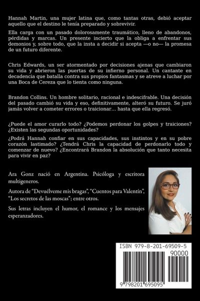Hannah Martin, una mujer latina que, como tantas otras, debió aceptar aquello que el destino le tenía preparado y sobrevivir. Ella carga con un pasado dolorosamente traumático, lleno de abandonos, pérdidas y marcas. Un presente incierto que la obliga a enfrentar sus demonios y, sobre todo, que la insta a decidir si acepta ¿o nö la promesa de un futuro diferente. Chris Edwards, un ser atormentado por decisiones ajenas que cambiaron su vida y abrieron las puertas de su infierno personal. Un cantante en decadencia que batalla contra sus propios fantasmas y se atreve a luchar por una Boca de Cereza que lo tienta como ninguna. Brandon Collins. Un hombre solitario, racional e indescifrable. Una decisión del pasado cambió su vida y eso, definitivamente, alteró su futuro. Se juró jamás volver a cometer errores o traicionar… hasta que ella regresó. ¿Puede el amor curarlo todo? ¿Podemos perdonar los golpes y traiciones? ¿Existen las segundas oportunidades? ¿Podrá Hannah confiar en sus capacidades, sus instintos y en su pobre corazón lastimado? ¿Tendrá Chris la capacidad de perdonarlo todo y comenzar de nuevo? ¿Encontrará Brandon la absolución que tanto necesita para vivir en paz? Amarás y odiarás a cada uno de los personajes. Nadie, absolutamente nadie, es completamente bueno o malo. Todos llevamos demonios y deseos reprimidos. Todos podemos pecar y, definitivamente, todos estamos jodidos.