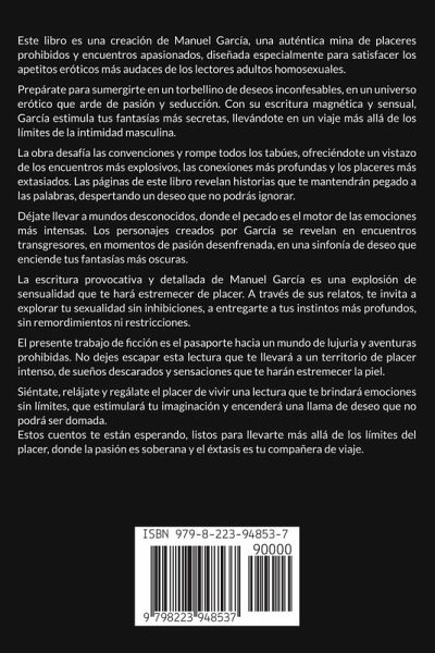 Este libro es una creación de Manuel García, una auténtica mina de placeres prohibidos y encuentros apasionados, diseñada especialmente para satisfacer los apetitos eróticos más audaces de los lectores adultos homosexuales. Prepárate para sumergirte en un torbellino de deseos inconfesables, en un universo erótico que arde de pasión y seducción. Con su escritura magnética y sensual, García estimula tus fantasías más secretas, llevándote en un viaje más allá de los límites de la intimidad masculina. La obra desafía las convenciones y rompe todos los tabúes, ofreciéndote un vistazo de los encuentros más explosivos, las conexiones más profundas y los placeres más extasiados. Las páginas de este libro revelan historias que te mantendrán pegado a las palabras, despertando un deseo que no podrás ignorar. Déjate llevar a mundos desconocidos, donde el pecado es el motor de las emociones más intensas. Los personajes creados por García se revelan en encuentros transgresores, en momentos de pasión desenfrenada, en una sinfonía de deseo que enciende tus fantasías más oscuras. La escritura provocativa y detallada de Manuel García es una explosión de sensualidad que te hará estremecer de placer. A través de sus relatos, te invita a explorar tu sexualidad sin inhibiciones, a entregarte a tus instintos más profundos, sin remordimientos ni restricciones. El presente trabajo de ficción es el pasaporte hacia un mundo de lujuria y aventuras prohibidas. No dejes escapar esta lectura que te llevará a un territorio de placer intenso, de sueños descarados y sensaciones que te harán estremecer la piel. Siéntate, relájate y regálate el placer de vivir una lectura que te brindará emociones sin límites, que estimulará tu imaginación y encenderá una llama de deseo que no podrá ser domada. Estos cuentos te están esperando, listos para llevarte más allá de los límites del placer, donde la pasión es soberana y el éxtasis es tu compañera de viaje.