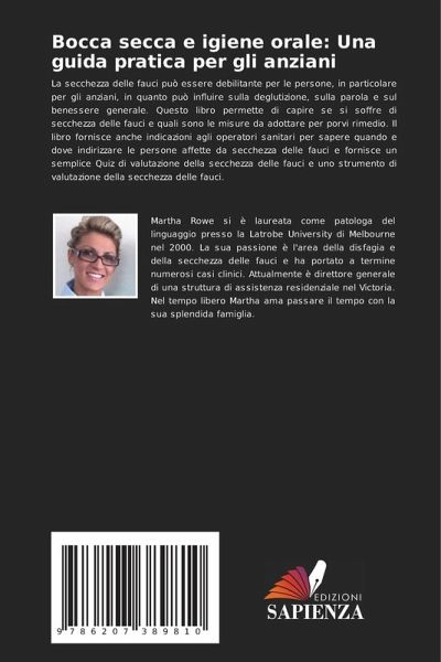 La secchezza delle fauci può essere debilitante per le persone, in particolare per gli anziani, in quanto può influire sulla deglutizione, sulla parola e sul benessere generale. Questo libro permette di capire se si soffre di secchezza delle fauci e quali sono le misure da adottare per porvi rimedio. Il libro fornisce anche indicazioni agli operatori sanitari per sapere quando e dove indirizzare le persone affette da secchezza delle fauci e fornisce un semplice Quiz di valutazione della secchezza delle fauci e uno strumento di valutazione della secchezza delle fauci.