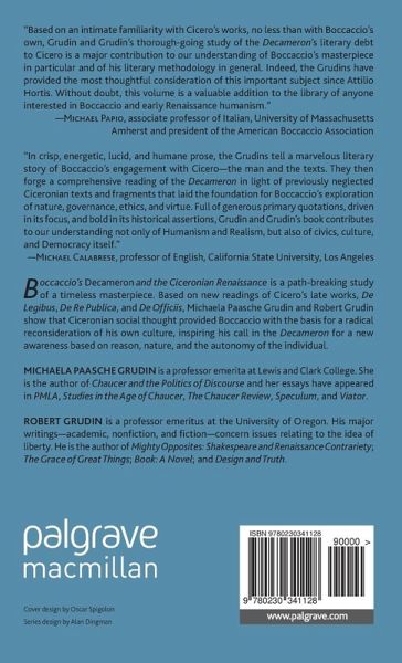"Boccaccio scholars and all readers interested in the Decameron who are tempted to dismiss this study for its title's last words - the Ciceronian Renaissance in the Decameron - should take heed: This substantial volume by Michaela Paasche and Robert Grudin, a wife and husband team of scholars, succeeds in offering what many other studies of comparable length have failed to do, namely, a comprehensive analysis of Boccaccio's masterpiece in its entirety from a novel perspective, which is appealing and which explains many challenging elements of Boccaccio's masterpiece." - Annali d'Italianistica