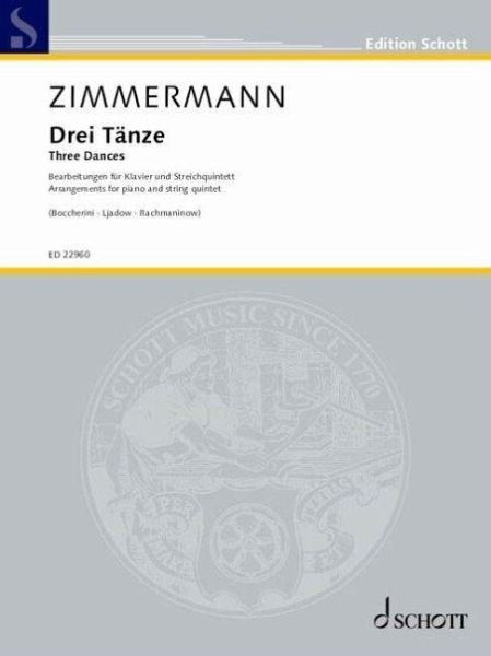 (Ensemble). The pieces in Drei Tanze are part of a corpus of over 100 arrangements that Bernd Alois Zimmermann made for radio use, primarily for the NWDR. Now these delightful arrangements are also being made available for home and concert use.