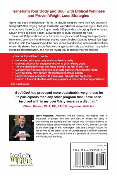 Transform Your Body and Soul with Biblical Wellness and Proven Weight Loss Strategies Steve had been overweight all his life. In fact, he weighed more than 100 pounds in first grade! After playing college football he vowed never to exercise again. That was one promise he kept, ballooning to nearly 350 pounds and staying there for years. Driven by his declining health, Steve began to study the Bible for help. Steve lost 130 pounds and launched a stunningly successful weight-loss program in his church, community and through out the nation. In Bod4God, he reveals four keys from the Bible that have unlocked the door to health and fitness for him and countless others. He shares these simple lifestyle changes-both inside and out-that have led to incredible transformation, and now he invites you to change your life forever! In this book you'll learn how to:Honor God with your body and stop feeling guilty. Motivate yourself for change and stick to your healthy goals. Tailor a plan just for you, and enjoy doing it the rest of your life. Manage your eating and retrain your taste buds to crave healthy foods. Get your body moving with fitness tips to increase energy. Build your circle of support to encourage, educate and equip you. Launch a fun and effective wellness program in your church or organization. And much more!