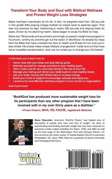 Transform Your Body and Soul with Biblical Wellness and Proven Weight Loss Strategies Steve had been overweight all his life. In fact, he weighed more than 100 pounds in first grade! After playing college football he vowed never to exercise again. That was one promise he kept, ballooning to nearly 350 pounds and staying there for years. Driven by his declining health, Steve began to study the Bible for help. Steve lost 130 pounds and launched a stunningly successful weight-loss program in his church, community and through out the nation. In Bod4God, he reveals four keys from the Bible that have unlocked the door to health and fitness for him and countless others. He shares these simple lifestyle changes-both inside and out-that have led to incredible transformation, and now he invites you to change your life forever! In this book you'll learn how to:Honor God with your body and stop feeling guilty. Motivate yourself for change and stick to your healthy goals. Tailor a plan just for you, and enjoy doing it the rest of your life. Manage your eating and retrain your taste buds to crave healthy foods. Get your body moving with fitness tips to increase energy. Build your circle of support to encourage, educate and equip you. Launch a fun and effective wellness program in your church or organization. And much more!