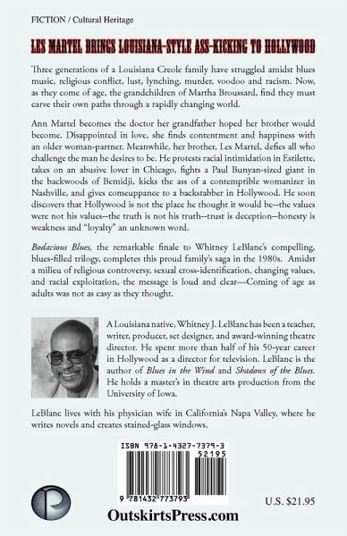 Bodacious Blues completes the saga-trilogy of a Creole family from Estilette Louisiana. From the depression on, three generations of this family have struggled in the midst of blues music, religious conflicts, lust, lynching, murder, voodoo, and racism. Now comes the grandchildren of Martha Broussard, who carve out paths through the changing world, and their stories emerge as they experience the rites of passage into adulthood. Ann Martel develops into the doctor that her grandfather hoped her brother would become. Disappointed in love, she finds contentment and happiness with an older woman-partner. Meanwhile, her brother, Les Martel, defies all who challenge the man he desires to be. Believing in an eye for an eye, he kicks the ass of anyone who stands in his way. He protests racial intimidation in Estilette, takes on an abusive lover in Chicago, fights a Paul Bunyan giant in the backwoods of Bemidji, kicks the ass of a contemptible womanizer in Nashville, and gives comeuppance to a backstabber in Hollywood. Living life on his own terms, he soon discovers that Hollywood is not the place he thought it would be- the values were not his values- the truth was not his truth- trust was deception- honesty was weakness and loyalty was an unknown word. In Bodacious Blues, Les Martel brings the saga of this proud family, to a final conclusion in the 1980's. In a milieu of religious controversy, sexual cross-identification, and the racial exploitations of Hollywood, he discovers that coming of age as a man was not as easy as he thought. Early review comments of this final novel of the trilogy follow: "Whitney LeBlanc's, Bodacious Blues is an excellent and entertaining coda to his explosive Creole family trilogy. As with his two preceding volumes, Blues in the Wind and Shadows of the Blues-Bodacious Blues and its lead character Les Martel, takes us on a soulful and heartfelt journey. It was hard to put down." Robert Hooks -Award winning actor; producer; founder Negro Ensemble Company, The Group Theatre Workshop & The DC Black Repertory Company. "What an exciting novel. My mother, her father and his mother were born in Waterproof, Louisiana. This novel reminded me of some of the stories I heard. There is such a rich cultural history in Louisiana I felt like a fly on the wall experiencing Les's journey. This feels like as bestseller and a film.." Marla Gibbs -Lead Actress of 227 series. Major supporting actress of The Jeffersons series. Appeared in over 100 films and television productions. Producer, writer and recipient of many awards. "Talent will out! Whitney has just completed his third historical novel. Last of the trilogy, Bodacious Blues depicts the trials and tribulations of the townspeople of Estilette Louisiana in their association with its most prominent families, the Fergerson/Broussards. Blues, voodoo and the inborn racism of the area touches everyone's lives in this, Whitney's tense climatic finish to the Fergerson/Broussard family.- Great reading!!!!" H. Wesley Kenney- Seven time Emmy winning Television Producer/Director "I have known Whitney J. LeBlanc since 1963 and he is without doubt the most creative man know. A brilliant scenic designer, playwright, director, stained glass artist and now novelist. Whitney never ceases to amaze. With Bodacious Blues, he draws us into the life of Les Martel, aspiring actor and a southern fish trying to swim in northern waters. It's a wonderful and very entertaining story that finds relevance for our present times. Well done my friend!" Conrad John Schuck-Television, movie and stage actor.
