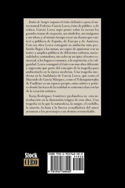 Bodas de Sangre meant the definitive success -both of public and critique- for playwright Federico Garcia Lorca. As a playwright he succeeded at staging the great issues of his poetry, his symbols, images and ideas, while creating a dramatic performance that captivated the audiences of Spain, Europe and the Americas. With this play Lorca achieved his most cherished ambition: to reach the masses, to impassionate with his plays vast and differently cultured audiences of diverse origins, nationalities and customs, without debasing himself to «commercial theater» commonplaces and vulgarity. Lorca succeeded with a different and suggestive play, deeply rooted in the classic tragedy concept and staged in modern times. A modern tragedy in Garcia Lorca's Andalusia, that in a similar way to Garcia Marquez's Macondo, or Faulkner's Yoknapatawpha, becomes a particular space, part myth part poetry, where reality intertwines with artistic creation. In this edition Borja Rodriguez Gutierrez analyzes in depth the tragic dimension of this Garcia Lorca play, where nature, blood, knives, death, the moon, and the overwhelming force of love, drag the main characters down into their unavoidable, tragic, destiny.