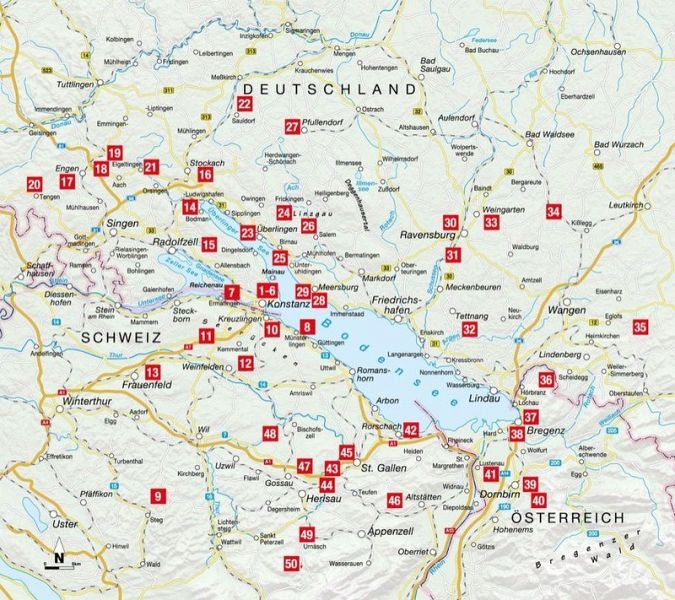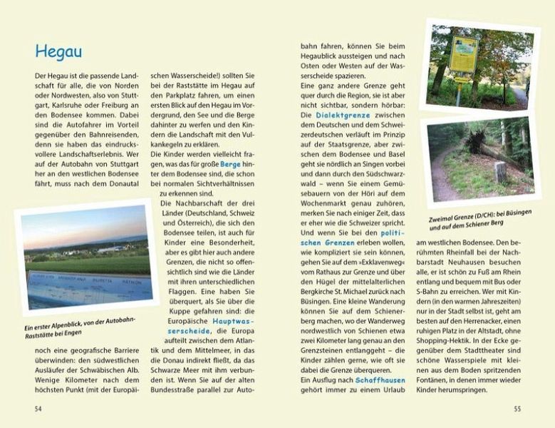 Die liebevoll zusammengetragenen Ideen im Buch wurden mit Bedacht ausgewählt und befinden sich überwiegend in der Umgebung bzw. dem Umland des Bodensees. So spielt z. B. der Hegau eine größere Rolle, aber auch in und um Ravensburg finden sich tolle Vorschläge. Ebenso in St. Gallen und südlich davon. Insgesamt 50 Vorschläge sollen es sein, wobei man diese Zahl nicht als abschließend betrachten darf. Viele Tipps beinhalten mehrere Möglichkeiten. So gibt es u. a. verschiedene vorgestellte Wege bei Wanderausflügen, die Insel Mainau an sich beinhaltet allein schon eine Vielzahl an Optionen, aber auch eine Erkundungstour durch St. Gallen hält so einiges bereit.