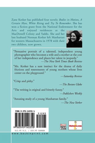 Zane Kotker wrote Bodies in Motion from 8:00 A.M. to noon on Tuesdays and Fridays-when her babysitter came. Upon publication of this early feminist novel in 1972, The New York Times Book Review hailed it as "a persuasive portrait of a talented, independent young photographer who becomes a wife and mother at the cost of her independence...unbitchy, honest, and it makes its point." The National Endowment for the Arts awarded its author a fiction grant. Her second novel, A Certain Man, tells of Charles ("Arley") Minor, who preached resurrection in the Congregational churches of rural New England and in the inner cities of Boston and Hartford before, during, and after World War II. "Rigor of thought and aptness of expression found only infrequently in the modern novel," said The Christian Science Monitor. In White Rising, Kotker evoked King Philip's War (1675-76) between New England's colonists and its indigenous Americans. Of this historical novel, The New Yorker said, "[Zane Kotker's] ambitious effort to describe the war from the inside (or, rather, from both insides) is entirely successful." In Try to Remember, a family is devastated by an accusation of sexual abuse during the four-year wave (1988-1992) of false accusations. "Skillfully shifting among various viewpoints, Kotker renders sympathetic the character and motives of people who find themselves irreconcilably opposed," said The New York Times Book Review. Zane Kotker has published a dozen short stories and won a Must Read 2012 designation from the Massachusetts Center for the Book for her poetry chapbook, Old Ladies in the Locker Room and Pool. She lives in Western Massachusetts, halfway between her childhood home in Vermont and New York's Upper West Side where she raised her own children. www.zanekotker.com