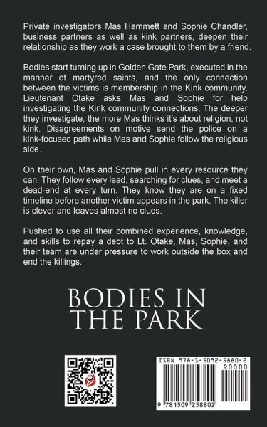 Private investigators Mas Hammett and Sophie Chandler, business partners as well as kink partners, deepen their relationship as they work a case brought to them by a friend. Bodies start turning up in Golden Gate Park, executed in the manner of martyred saints, and the only connection between the victims is membership in the Kink community. Lieutenant Otake asks Mas and Sophie for help investigating the Kink community connections. The deeper they investigate, the more Mas thinks it's about religion, not kink. Disagreements on motive send the police on a kink-focused path while Mas and Sophie follow the religious side. On their own, Mas and Sophie pull in every resource they can. They follow every lead, searching for clues, and meet a dead-end at every turn. They know they are on a fixed timeline before another victim appears in the park. The killer is clever and leaves almost no clues. Pushed to use all their combined experience, knowledge, and skills to repay a debt to Lt. Otake, Mas, Sophie, and their team are under pressure to work outside the box and end the killings.