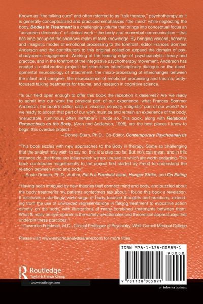 Bodies in Treatment is a challenging volume that brings into conceptual focus an "unspoken dimension" of clinical work - the body and nonverbal communication - that has long occupied the shadowy realm of tacit knowledge. By bringing visceral, sensory, and imagistic modes of emotional processing to the forefront, Editor Frances Sommer Anderson and the contributors to this original collection expand the domain of psychodynamic engagement. Working at the leading edge of psychoanalytic theory and practice, and in the forefront of the integrative psychotherapy movement, Anderson has created a collaborative project that stimulates interdisciplinary dialogue on the developmental neurobiology of attachment, the micro-processing of interchanges between the infant and caregiver, the neuroscience of emotional processing and trauma, body-focused talking treatments for trauma, and research in cognitive science. Enlightened by experiencing body-based treatments for thirty years, Anderson reflects on the powerful impact of these interventions, recounting attempts to integrate her somatically-informed discoveries into the "talking" frame. Reaching further, her contributors present richly informative accounts of how experiences in body-based modalities can be creatively integrated into a psychoanalytic framework of treatment. Readers are introduced to specialized modalities, such as craniosacral therapy and polarity therapy, as well as to the adjunctive use of yoga, the effectiveness of which can be grounded neurophysiologically. Somatic interventions are discussed in terms of the extent to which they can promote depth-psychological change outside the psychoanalytic consulting room as well as how they can enrich the relational process in psychodynamic treatment. The final sections of Bodies in Treatment explore the range of ways in which patients' and therapists' bodies engage, sustain, and contain the dynamics of treatment.