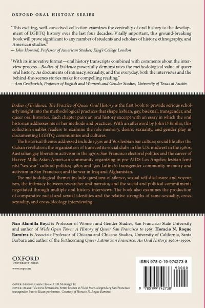 When written sources are scarce, historians often turn to oral histories for evidence. Bodies of Evidence: The Practice of Queer Oral History is the first book to provide serious scholarly insight into the methodological practices that shape lesbian, gay, bisexual, transgender, and queer oral histories. The volume opens up a critical dialogue on the challenges of creating an archive of queer lives. Highlighting the work of fourteen authors who focus their research on queer community history, culture, and politics, each chapter pairs an oral history excerpt with an original essay in which the oral historian addresses his or her methods and practices. With an afterword by the preeminent scholar in the field, John D'Emilio, this collection enables readers to examine both a series of oral histories and analysis of the role memory, desire, sexuality, and gender play in documenting LGBTQ communities and cultures. The historical themes addressed within include lesbian bar history in San Francisco (c. 1940s, 1950s); early homophile organizing and social activism in Los Angeles (c. 1950s and 1960s); Third World Liberation and feminist antiwar activism in the U.S. and Canada (c. 1960s, 1970s); electoral politics and the career of Harvey Milk, the first openly gay elected official in San Francisco (1970s); Latino AIDS memory and activism in San Francisco (1980s, 1990s); and the war in Iraq (2000s). The methodological themes addressed in this book that are relevant to the practice of oral history include questions of sexual self-disclosure and voyeurism in the uses of oral history methods by queer studies scholars; the intimacy between researcher and narrator negotiated through multiple oral history interviews and on-going casual conversations; the production of comparative racial and sexual identities within the context of oral history interviews; the production of in-group mythology by same-sexuality interviewing--and the possible benefits of cross-sexuality and cross-ideology interviewing; what heterosexually-identified narrators can tell us about LGBTQ life and death; the silences imposed by repressive U.S. government policy about sexual self-disclosure and the limits of permissible speech in highly politicized discourses such as "gays in the military." These themes provide new and insightful structures for thinking about oral history methods--both in general and in relation to the production of LGBTQ history.