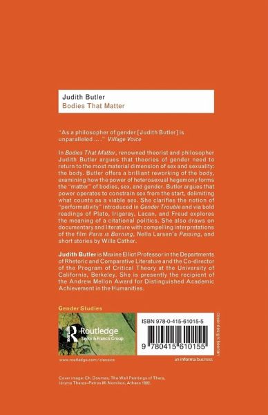 In Bodies That Matter, renowned theorist and philosopher Judith Butler argues that theories of gender need to return to the most material dimension of sex and sexuality: the body. Butler offers a brilliant reworking of the body, examining how the power of heterosexual hegemony forms the "matter" of bodies, sex, and gender. Butler argues that power operates to constrain sex from the start, delimiting what counts as a viable sex. She clarifies the notion of "performativity" introduced in Gender Trouble and via bold readings of Plato, Irigaray, Lacan, and Freud explores the meaning of a citational politics. She also draws on documentary and literature with compelling interpretations of the film Paris is Burning, Nella Larsen's Passing, and short stories by Willa Cather.