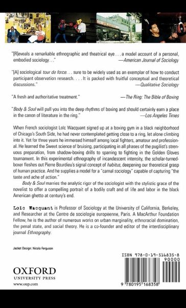 When French sociologist Lo c Wacquant signed up at a boxing gym in a black neighborhood of Chicago's South Side, he had never contemplated getting close to a ring, let alone climbing into it. Yet for three years he immersed himself among local fighters, amateur and professional. He learned the Sweet science of bruising, participating in all phases of the pugilist's strenuous preparation, from shadow-boxing drills to sparring to fighting in the Golden Gloves tournament. In this experimental ethnography of incandescent intensity, the scholar-turned-boxer supplies a model for a "carnal sociology" capable of capturing "the taste and ache of action." Body & Soul marries the analytic rigor of the sociologist with the stylistic grace of the novelist to offer a compelling portrait of a bodily craft and of life and labor in the black American ghetto, but also a fascinating tale of personal transformation and social transcendence.