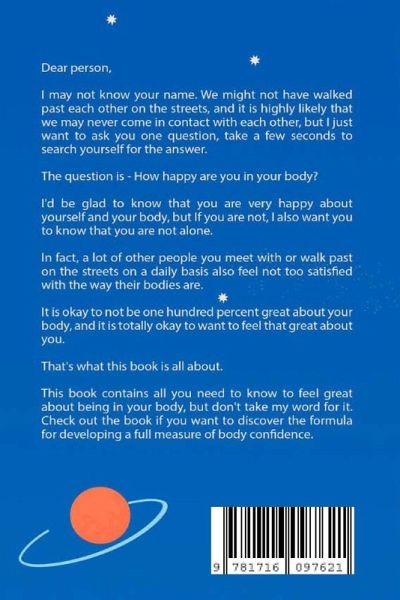 Dear person, I may not know your name. We might not have walked past each other on the streets, and it is highly likely that we may never come in contact with each other, but I just want to ask you one question, take a few seconds to search yourself for the answer. The question is¿ How happy are you in your body? I'd be glad to know that you are very happy about yourself and your body, but If you are not, I also want you to know that you are not alone. In fact, a lot of other people you meet with or walk past on the streets on a daily basis also feel not too satisfied with the way their bodies are. It is okay to not be one hundred percent great about your body, and it is totally okay to want to feel that great about you. That's what this book is all about. This book contains all you need to know to feel great about being in your body, but don't take my word for it. Check out the book if you want to discover the formula for developing a full measure of body confidence.