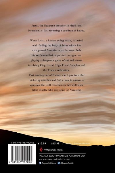 Jesus, the Nazarene preacher, is dead, and Jerusalem is fast becoming a cauldron of hatred. When Lynx, a Roman ex-legionary, is tasked with finding the body of Jesus which has disappeared from the cross, he soon finds himself embroiled in political intrigue and playing a dangerous game of cat and mouse involving King Herod, High Priest Caiaphas and the Roman authorities. Fast running out of friends, can Lynx trust the bickering apostles and find a way to answer a question that still reverberates two millennia later: exactly who was Jesus of Nazareth?