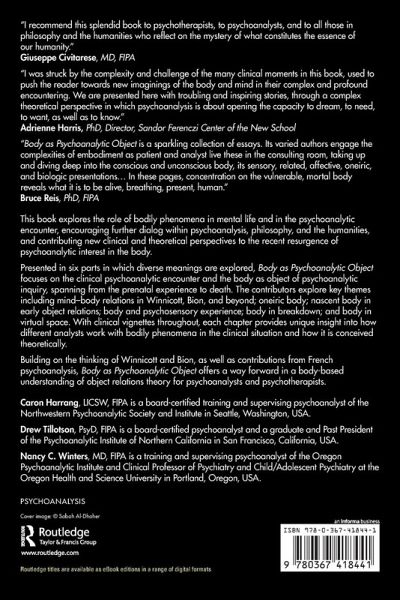 "It is paradoxical and intriguing that after a century of existence psychoanalysis is still so uncomfortable saying what it knows about the body. Paradoxical because psychoanalysis was born giving voice to the body of hysterics. Yet over time, the picture became that of a disincarnate analyst for a disincarnate patient, prompting Paula Heimann to remind us the purpose of psychoanalysis is not to transform the analyst into a mechanical brain, which produces interpretations purely on the basis of intellectual procedures. In her classic 1949 essay on countertransference, Heimann denounces a split not yet resolved in psychoanalytic theorizing on the link between mind and body. Otherwise one would not understand why a book like Body as psychoanalytic object can be so intriguing. The fact is, this remains an exciting frontier of research in psychoanalysis. How body and mind communicate remains quite mysterious. We know that the body that interests us does not speak in words; still it 'speaks' and cannot be placed entirely outside the field of the symbolic even when it is deprived of the ability to communicate lexically, as is the case with small children. It is not at all obvious that even the body of the infant, that is, the child who does not yet have access to words, is already touched by culture; which means that it starts immediately (even before birth) to exist as a body that has its own intentionality, a body that dreams, a body that communicates. Nor is it clear what relation there is between intersubjectivity based on instinct, what Bion calls the proto-mental system-the ability of individuals to connect with each other on the basis of certain 'valences'-and intersubjectivity based on language. This outstanding book co-authored and edited by Caron Harrang, Drew Tillotson, and Nancy Winters promises readers an extraordinary journey in which, little by little, they will be able to reflect on these issues and see them in the light of a series of rigorous, provocative, and sophisticated essays that make up the volume. I recommend this splendid book to psychotherapists, to psychoanalysts, and to all those in philosophy and the humanities who reflect on the mystery of what constitutes the essence of our humanity." - Giuseppe Civitarese, MD, FIPA, author of Sublime Subjects: Aesthetic Experience and Intersubjectivity in Psychoanalysis