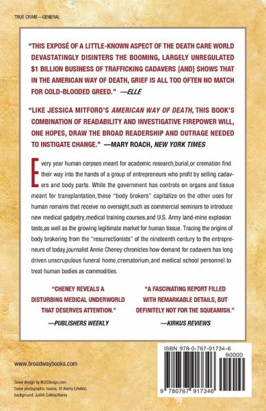 "You are a little soul carrying around a corpse.” —Epictetus "Wherever the corpse is, there the vultures will follow.” —Matthew 24:28 Body Brokers is an audacious, disturbing, and compellingly written investigative exposé of the lucrative business of procuring, buying, and selling human cadavers and body parts. Every year human corpses meant for anatomy classes, burial, or cremation find their way into the hands of a shadowy group of entrepreneurs who profit by buying and selling human remains. While the government has controls on organs and tissue meant for transplantation, these "body brokers” capitalize on the myriad other uses for dead bodies that receive no federal oversight whatsoever: commercial seminars to introduce new medical gadgetry; medical research studies and training courses; and U.S. Army land-mine explosion tests. A single corpse used for these purposes can generate up to $10,000. As journalist Annie Cheney found while reporting on this subject over the course of three years, when there's that much money to be made with no federal regulation, there are all sorts of shady (and fascinating) characters who are willing to employ questionable practices—from deception and outright theft—to acquire, market and distribute human bodies and parts. In Michigan and New York she discovers funeral directors who buy corpses from medical schools and supply the parts to surgical equipment companies and associations of surgeons. In California, she meets a crematorium owner who sold the body parts of people he was supposed to cremate, generating hundreds of thousands of dollars in profits. In Florida, she attends a medical conference in a luxury hotel, where fresh torsos are delivered in Igloo coolers and displayed on gurneys in a room normally used for banquets. "That torso that you're living in right now is just flesh and bones to me. To me, it's a product,” says the New Jersey-based broker presiding over the torsos. Tracing the origins of body brokering from the "resurrectionists” of the nineteenth century to the entrepreneurs of today, Cheney chronicles how demand for cadavers has long driven unscrupulous funeral home, crematorium and medical school personnel to treat human bodies as commodities. Gripping, often chilling, and sure to cause a reexamination of the American way of death, Body Brokers is both a captivating work of first-person reportage and a surprising inside look at a little-known aspect of the "death care” world.