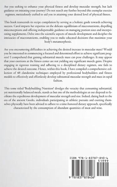 Are you seeking to enhance your physical fitness and develop muscular strength, but lack guidance on initiating your journey? Do not search any further beyond this exemplar exercise regimen, meticulously crafted to aid you in attaining your desired level of physical fitness. This book transcends its recipe compilation by serving as a holistic guide towards achieving success. Carol imparts her expertise on the delicate equilibrium of macronutrients, dispelling misconceptions and offering indispensable guidance on managing portion sizes and incorporating supplements. Delve into the scientific aspects of muscle development and decipher the intricacies of macronutrients, enabling you to make educated decisions that maximize your body's metamorphosis. Are you encountering difficulties in achieving the desired increase in muscular mass? Would you be interested in commencing a focused and determined effort to achieve significant progress? I comprehend that gaining substantial muscle mass can pose challenges. It may appear that your exertions at the fitness center are not yielding any significant muscle gains. Despite engaging in rigorous training and adhering to a disciplined dietary regimen, one fails to achieve the desired outcome. Hence, within this book, I have compiled a comprehensive collection of 48 clandestine techniques employed by professional bodybuilders and fitness models to effectively and effortlessly develop substantial muscular strength and mass in rapid fashion. This tome titled 'Bodybuilding Nutrition' divulges the veracity that consuming substantial, yet nutritionally balanced meals, stands as but one of the methodologies at our disposal to facilitate the expeditious development of muscular strength and size. Indeed, dating back to the era of the ancient Greeks, individuals participating in athletic pursuits and exerting themselves physically have been advised to adhere to a time-honored dietary approach, specifically characterized by the consumption of abundant quantities of meat and wine.