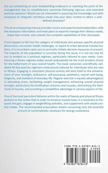 Are you embarking on your bodybuilding endeavors or reaching the point of discouragement due to unsatisfactory outcomes following rigorous and extended workout sessions? Would you be interested in acquiring the knowledge and skills necessary to integrate nutritious meals into your daily routine to attain a well-defined physique? This all-encompassing manual provides novice and experienced bodybuilders with the necessary information and meal plans to expertly manage their dietary needs, shape lean muscle, and unleash the complete capabilities of their physiques. If you happen to fall into the category of individuals who possess specific physical dimensions, encounter health challenges, or aspire to enact personal transformations, it is incumbent upon you to promptly initiate decisive measures at present. The majority of the population is currently facing this issue; it is not too late for you to embark on a workout regimen, particularly tailored to your needs. Commencing a fitness regimen today would undoubtedly be the most prudent choice for the betterment of your overall health. This book comprises scientifically validated 30-day exercise regimens meticulously tailored for individuals who are new to fitness. Engaging in consistent physical activity will lend itself to the enhancement of your strength, endurance, self-assurance, aesthetics, overall well-being, longevity, and standard of everyday life. Regular exercise is equally advantageous in alleviating stress, facilitating weight management, enhancing overall physical strength, particularly the fortification of bones and muscles, diminishing the likelihood of injuries, and providing a competitive advantage in various aspects of life. One of the most persistent fallacies within the realm of beauty and physical fitness pertains to the notion that in order to enhance muscle mass, it is necessary to frequent the gym, engage in weightlifting activities, and supplement with ample protein intake. The recommended prescription entails consuming only the essential amount of carbohydrates necessary for energy sustenance.