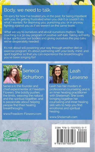 When was the last time you looked in the mirror and spoke kindly to your body? What do you think God would say? Discover how speaking from your spirit partnered with the Holy Spirit can heal your relationship with your body and bring you into proper alignment spirit-soul-body as you drop the pounds! Are you done trying to willpower your way through another diet or exercise program? Done excluding food groups or not being able to have a normal meal with people? In this book you'll learn a spirit-first way of working on issues that have sabotaged your ability to lose or maintain weight loss. The premise of our program is that each day, you'll spend a few minutes speaking from your spirit alive in Christ to your body. Each day has a different topic with a short explanation of how and why it contributes to your weight, followed by an example of what you can say from your spirit to your body to encourage healing. You may have suspected some hidden reasons why you have such a hard time with weight loss. Maybe you blame your metabolism, your thyroid, hormones, or other mysterious factors. The truth is, so much more is going on than calories in, calories out. Many factors within the body and mind influence your weight. This thirty-day plan addresses them one by one. In this book you'll learn:How to reorder yourself spirit-soul-body rather than the other way around How to get your "Texas high school football coach" soul to yield to the kinder more loving coaching voice of your spirit. How to ditch the dietary dogma and find your healthy balance We don't give you any rules about food although as a result of speaking to your body, your eating will probably shift a bit. The people who have already used our program have reported fewer cravings, less hunger, and eating better quality food. Each day focuses on a different physical or emotional health component for you to talk to your body about. Tapping exercises similar to EFT and TFT are also included in the book to add another layer of body-mind-spirit connection when talking to yourself. Testimonies from those that have already tried the program (and purposely didn't diet while trying it!): "I'm down 2lbs in 30 days and I have a better attitude toward my body. I've begun a process of making peace with and partnering with my body that has been very needful." Jane I "I lost 5lbs in 30 days. Looking at food differently has been the biggest difference. My body isn't craving junk food, and because I'm feeling better, I'm walking more, which I love to do." Sue B "I lost 7 lbs and I purposely was not dieting! I've noticed a significant difference in the past couple weeks in the ability for my spirit to rise above my emotions/soul and implement positive mindsets. This is HUGE for me!" Veronica M