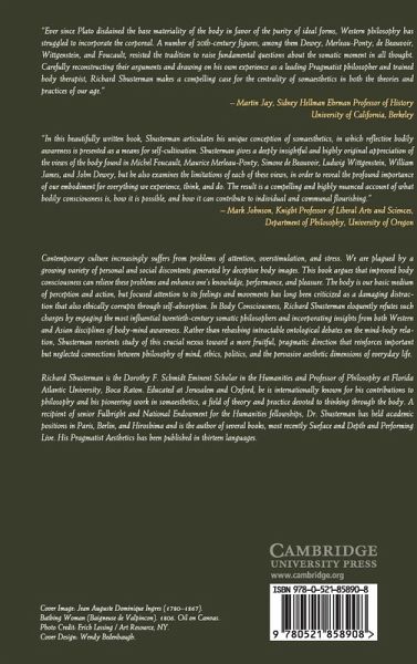 Contemporary culture increasingly suffers from problems of attention, over-stimulation, and stress, and a variety of personal and social discontents generated by deceptive body images. This book argues that improved body consciousness can relieve these problems and enhance one's knowledge, performance, and pleasure. The body is our basic medium of perception and action, but focused attention to its feelings and movements has long been criticised as a damaging distraction that also ethically corrupts through self-absorption. In Body Consciousness, Richard Shusterman refutes such charges by engaging the most influential twentieth-century somatic philosophers and incorporating insights from both Western and Asian disciplines of body-mind awareness. Rather than rehashing intractable ontological debates on the mind-body relation, Shusterman reorients study of this crucial nexus towards a more fruitful, pragmatic direction that reinforces important but neglected connections between philosophy of mind, ethics, politics, and the pervasive aesthetic dimensions of everyday life.