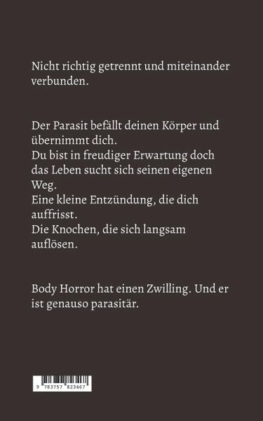 Nicht richtig getrennt und miteinander verbunden. Der Parasit befällt deinen Körper und übernimmt dich. Du bist in freudiger Erwartung doch das Leben sucht sich seinen eigenen Weg.Eine kleine Entzündung, die dich auffrisst.Die Knochen, die sich langsam auflösen. Body Horror hat einen Zwilling. Und er ist genauso parasitär.