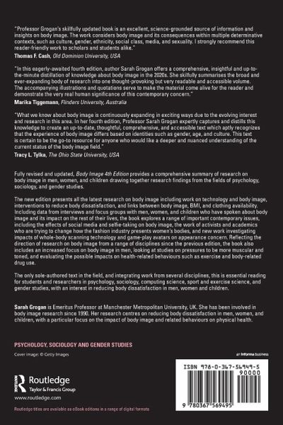 "What we know about body image is continuously expanding in exciting ways due to the evolving interest and research in this area. In her fourth edition, Professor Sarah Grogan expertly captures and distills this knowledge to create an up-to-date, thoughtful, comprehensive, and accessible text which aptly recognizes that the experience of body image differs based on identities such as gender, age, and culture. This text is certain to be the go-to resource for anyone who would like a deeper and nuanced understanding of the current status of the body image field."