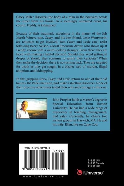 Casey Miller discovers the body of a man in the boatyard across the street from his house. In a seemingly unrelated event, his cousin, Freddy, is kidnapped. Because of their traumatic experience in the matter of the Salt Marsh Winery case, Casey, and his best friend, Lexie Wentworth, are reluctant to get involved. But, Casey and Lexie can't resist following Barry Nelson, a local limousine driver, who shows up at Freddy's house with a weird-looking stranger. From there, they are faced with making a fateful decision. Should they avoid getting in deeper or should they continue to satisfy their curiosity? When they make the decision, there is no turning back. They are targeted for death as they get caught in a bizarre web of murder, illegal adoption, and kidnapping. In this gripping story, Casey and Lexie return to one of their old haunts, the Parks mansion, and make a startling discovery. None of their previous adventures tested their wits and courage as this one.