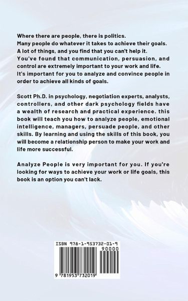 Where there are people, there is politics. Many people do whatever it takes to achieve their goals. A lot of things, and you find that you can't help it. You've found that communication, persuasion, and control are extremely important to your work and life. It's important for you to analyze and convince people in order to achieve all kinds of goals. Scott Ph.D. in psychology, negotiation experts, analysts, controllers, and other dark psychology fields have a wealth of research and practical experience. this book will teach you how to analyze people, emotional intelligence, managers, persuade people, and other skills. By learning and using the skills of this book, you will become a relationship person to make your work and life more successful. Analyze People is very important for you. If you're looking for ways to achieve your work or life goals, this book is an option you can't lack.