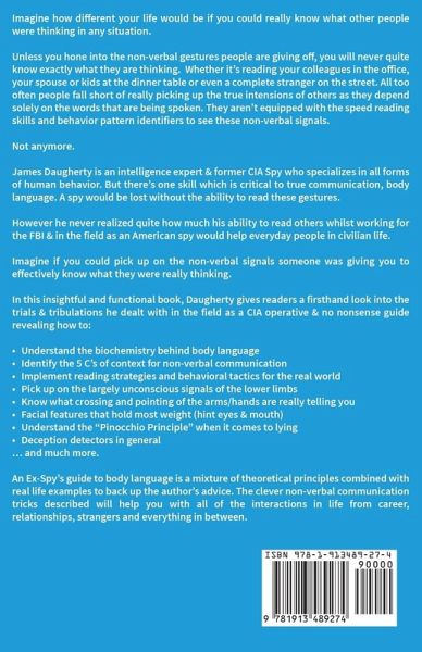 Imagine how different your life would be if you could really know what other people were thinking in any situation. Unless you hone into the non-verbal gestures people are giving off, you will never quite know exactly what they are thinking. Whether it’s reading your colleagues in the office, your spouse or kids at the dinner table or even a complete stranger on the street. All too often people fall short of really picking up the true intentions of others as they depend solely on the words that are being spoken. They aren’t equipped with the speed reading skills and behavior pattern identifiers to see these non-verbal signals. Not anymore. James Daugherty is an intelligence expert & former CIA Spy who specializes in all forms of human behavior. But there’s one skill which is critical to true communication, body language. A spy would be lost without the ability to read these gestures. However, he never realized quite how much his ability to read others whilst working for the FBI & in the field as an American spy would help everyday people in civilian life. Imagine if you could pick up on the non-verbal signals someone was giving you to effectively know what they were really thinking. In this insightful and functional book, Daugherty gives readers a firsthand look into the trials & tribulations he dealt with in the field as a CIA operative & no-nonsense guide revealing how to: Understand the biochemistry behind body language Identify the 5 C’s of context for non-verbal communication Implement reading strategies and behavioral tactics for the real world Pick up on the largely unconscious signals of the lower limbs Know what crossing and pointing of the arms/hands are really telling you The facial features that hold the most weight Understand the "Pinocchio Principle" when it comes to lying Deception detectors in general … and much more. An Ex-Spy’s guide to body language is a mixture of theoretical principles combined with real-life examples to back up the author’s advice. The clever non-verbal communication tricks described will help you with all of the interactions in life from career, relationships, strangers and everything in between.