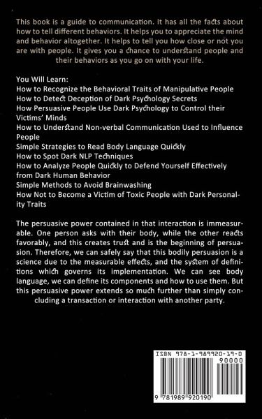 This book is a guide to communication. It has all the facts about how to tell different behaviors. It helps you to appreciate the mind and behavior altogether. It helps to tell you how close or not you are with people. It gives you a chance to understand people and their behaviors as you go on with your life. You Will Learn: How to Recognize the Behavioral Traits of Manipulative People How to Detect Deception of Dark Psychology Secrets How Persuasive People Use Dark Psychology to Control their Victims' Minds How to Understand Non-verbal Communication Used to Influence People Simple Strategies to Read Body Language Quickly How to Spot Dark NLP Techniques How to Analyze People Quickly to Defend Yourself Effectively from Dark Human Behavior Simple Methods to Avoid Brainwashing How Not to Become a Victim of Toxic People with Dark Personality Traits The persuasive power contained in that interaction is immeasurable. One person asks with their body, while the other reacts favorably, and this creates trust and is the beginning of persuasion. Therefore, we can safely say that this bodily persuasion is a science due to the measurable effects, and the system of definitions which governs its implementation. We can see body language, we can define its components and how to use them. But this persuasive power extends so much further than simply concluding a transaction or interaction with another party.