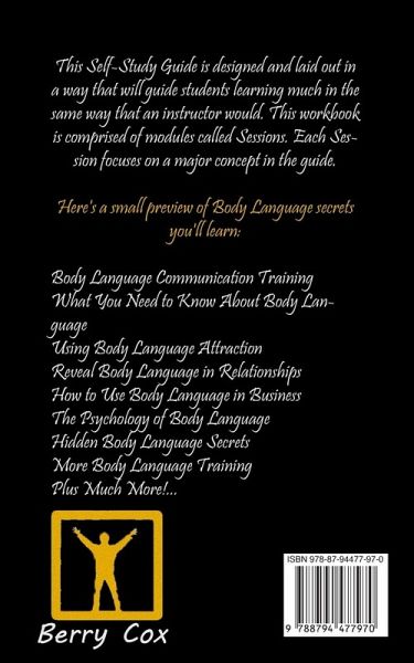This Self-Study Guide is designed and laid out in a way that will guide students learning much in the same way that an instructor would. This workbook is comprised of modules called Sessions. Each Session focuses on a major concept in the guide. Here's a small preview of Body Language secrets you'll learn: Body Language Communication Training What You Need to Know About Body Language Using Body Language Attraction Reveal Body Language in Relationships How to Use Body Language in Business The Psychology of Body Language Hidden Body Language Secrets More Body Language Training Plus Much More!...