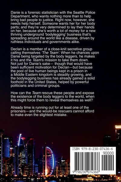 Danielle ('Danie') Riley is a forensic statistician with the Seattle Police Department, who wants nothing more than help to bring bad people to justice. Right now, however, she needs help herself. Someone wants her for her body parts; and they're very determined to get their hands on her, because she's worth a lot of money for a new thriving underground 'body legging' business that's spreading around the world like a disease, driven by ruthless individuals and governments alike. Declan is a member of a close-knit secretive group calling themselves 'The Team'. When he chances upon Danie being targeted by the body leggers, he makes it his and the Team's mission to take them down. Not just for Danie's sake- though that would have been sufficient motivation for Declan. But the pool of live human beings kept in a prison in a Middle Eastern kingdom is steadily growing, and the body legging business has already gained a solid foothold in the United States, helped by powerful politicians and criminal groups. How can the Team rescue these people and expose the existence of the body leggers to the world, when this might force them to reveal themselves as well? Already time is running out for at least one of the prisoners-and the would-be rescuers cannot afford to delay any longer or to make even the slightest mistake.