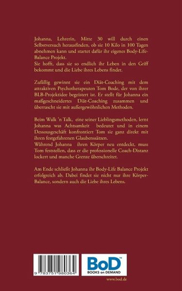 Johanna, Lehrerin, Mitte 30 möchte endlich schlank sein und sie startet ihr Body-Life-Balance Projekt, 10 Kilo in 100 Tagen. Zufällig gewinnt sie ein Coaching mit dem attraktiven Psychotherapeuten Tom Bode, der ihre BLB-Projektidee perfekt in sein Programm einbauen kann. Walk 'n Talk heißt eine seiner Lieblingsmethoden, bei der Johanna lernt, was Achtsamkeit bedeutet Am Ende schließt sie ihr Body-Life Balance Projekt erfolgreich ab. Dabei findet sie nicht nur die Körper-Balance in ihrem Leben, sondern auch die Liebe ihres Lebens.