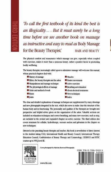 The beauty therapist, increasingly called upon to administer massage, will welcome this manual. Its modern and practical approach will appeal to all who wish to improve their standard of massage. The physical comfort and reassurance which massage can give, especially when coupled with exercises, make it more than a sensuous luxury: rather it is a positive factor in promoting bodily wellbeing. The clear and detailed explanations of massage techniques in 'Body Massage for the Beauty Therapist' are supplemented by many drawings and photographs, which also serve to clarify the structure of the human body and its functioning. The personality and qualities of the therapist are brought into perspective and helpful advice given on the organization of the salon. Valuable sections are included on relaxation techniques, correct breathing and exercises which the client can undertake. Aromatherapy and gyratory massage are also covered.