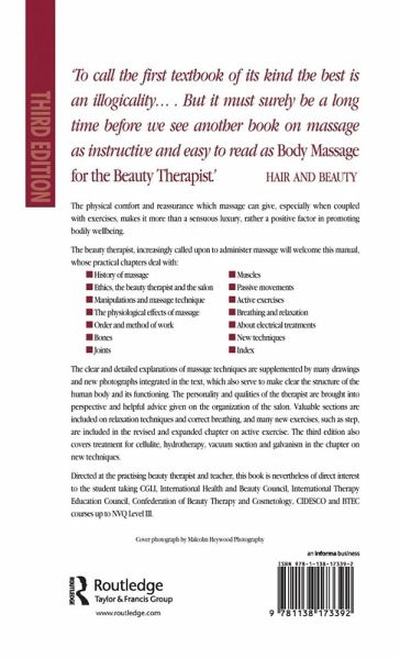 The beauty therapist, increasingly called upon to administer massage, will welcome this manual. Its modern and practical approach will appeal to all who wish to improve their standard of massage. The physical comfort and reassurance which massage can give, especially when coupled with exercises, make it more than a sensuous luxury: rather it is a positive factor in promoting bodily wellbeing. The clear and detailed explanations of massage techniques in 'Body Massage for the Beauty Therapist' are supplemented by many drawings and photographs, which also serve to clarify the structure of the human body and its functioning. The personality and qualities of the therapist are brought into perspective and helpful advice given on the organization of the salon. Valuable sections are included on relaxation techniques, correct breathing and exercises which the client can undertake. Aromatherapy and gyratory massage are also covered.