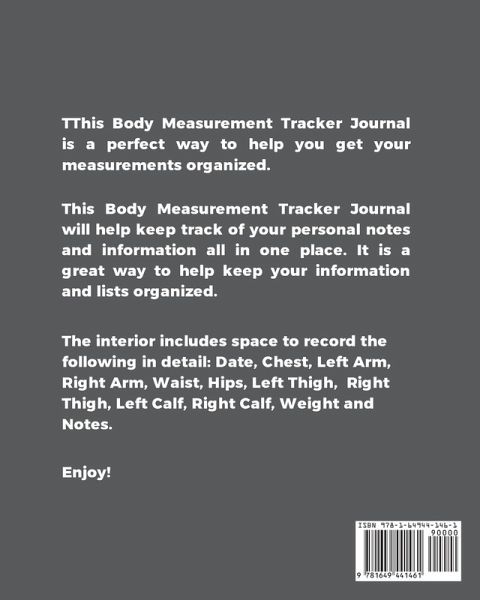 This Body Measurement Tracker is a perfect way to help you log your measurements. If you're into exercise & fitness & love a good daily workout at the gym, or if you're on a diet & just want to keep track of your progress & weight loss, this journal can be a great place to keep all your information in one place. Each page (worksheet) contains space to write: Date Chest Left Arm Right Arm Waist Hips Left Thigh Right Thigh Left Calf Right Calf Weight Notes - Great for writing your food intake, set goals, fat intake, plan, monitoring, emotions, how you feel, etc or whatever you wish to write. Makes great presents for both men & women to give as a gift. If you measure weekly, there's enough spaces for over 2 years. A great way to to get healthy is to be aware of your body changes as you progress towards your goal. Size is 8x10 inches, 112 pages, soft matte finish cover, white paper, paperback.