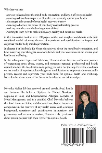 Whether you are:curious to learn about the mind-body connection, and how it affects your health wanting to learn how to prevent ill health, and naturally restore your health desiring to take control of your health recovery journey wanting to harness the power of your body's natural healing process seeking to understand the healing power of food wishing to learn how to make quick, easy, healthy and nutritious meals in this innovative book of over 150 pages, mother and daughter collaborate with their combined wealth of many decades of experience and qualifications to inspire and empower you for body-mind rejuvenation. In Chapter 1 of this book, Dr Vesna has the honour of educating you, the reader, about the mind-body connection, and how mastering your thoughts, emotions, beliefs and your environment can master your health and wellbeing. In the subsequent chapters of this book, Nevenka shares her journey of overcoming numerous personal, professional and health obstacles in her life. In addition to inspiring you with her journey, Nevenka also draws on her wealth of experience, knowledge and qualifications to empower you to naturally prevent, recover and rejuvenate your body-mind for optimal health and wellbeing. Drawing on her qualifications and experience as a Chef, Clinical Nutritionist and health practitioner, Nevenka also shares some of her favourite healthy and nutritious recipes. She created these specifically for her healing journey. This truly is an integrated step by step journey to body-mind rejuvenation.