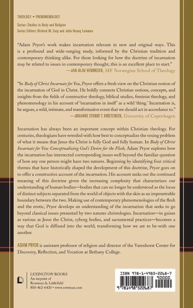 Incarnation has always been an important concept within Christian theology. For centuries theologians have wrestled with how best to conceptualize the vexing problem of what it means that Jesus the Christ is fully God and fully human. In this book, Adam Pryor explores how the incarnation has intersected corresponding issues well beyond the familiar question of how any one person might have two natures. Beginning by identifying four critical themes that have historically shaped the development of this doctrine, Pryor goes on to offer a constructive account of the incarnation. His account seeks out the continued meaning of this doctrine given the increasing complexity that characterizes our understanding of human bodies-bodies that can no longer be understood as the locus of distinct subjects separated from the world of objects with the skin as an impenetrable boundary between the two. Making use of contemporary phenomenologies of the flesh and the erotic, Pryor develops an understanding of the incarnation that seeks to go beyond classical issues presented by two natures christologies. Incarnation, in guises as various as Jesus the Christ, cyborg bodies, and sacramental practices, becomes a way that God is diffused into the world, transforming how we are to be-with one another.