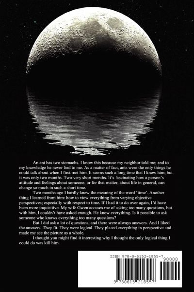 An ant has two stomachs. I know this because my neighbor told me; and to my knowledge he never lied to me. It's fascinating how a person's attitude and feelings about someone, about life in general, can change so much in such a short time. Two months ago I hardly knew the meaning of the word 'time'. Another thing I learned from him: how to view everything from varying objective perspectives; especially with respect to time. If I had it to do over again, I'd have been more inquisitive. My wife Gwen accuses me of asking too many questions, but with him, I couldn't have asked enough. He knew everything. Is it possible to ask someone who knows everything too many questions? But I did ask a lot of questions, and there were always answers. And I liked the answers. They fit. They were logical. They placed everything in perspective and made me see the picture as a whole. I thought you might find it interesting why I thought the only logical thing I could do was kill him.