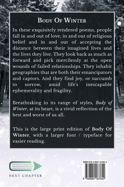 In these exquisitely rendered poems, people fall in and out of love, in and out of religious belief and in and out of accepting the distance between their imagined lives and the lives they live. They look back as much as forward and pick mercilessly at the open wounds of failed relationships. They inhabit geographies that are both their emancipators and captors. And they find joy, or succumb to sorrow, amid life's inescapable ephemerality and fragility. Breathtaking in its range of styles, Body of Winter, at its heart, is a vivid reflection of the best and worst of us all. This is the large print edition of Body Of Winter, with a larger font / typeface for easier reading.
