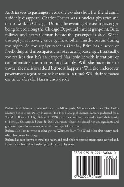 As Brita sees to passenger needs, she wonders how her friend could suddenly disappear? Charlot Fortier was a nuclear physicist and due to work in Chicago. During the evening, she sees a passenger being forced along the Chicago Depot rail yard at gunpoint. Brita follows, and hears German before the passenger is shot. When the zephyr is moving once again, another murder occurs during the night. As the zephyr reaches Omaha, Brita has a sense of foreboding and investigates a sinister acting passenger. Eventually, she realizes that he's an escaped Nazi soldier with intentions of compromising the nation's food supply. Will she have time to thwart the malicious deed before it happens? Will the undercover government agent come to her rescue in time? Will their romance continue after the Nazi is uncovered?