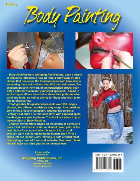 Body Painting, from Wolfgang Publications, uses a wealth of photos to introduce a new art form. Follow step-by-step photos that document the transformation from bare skin to something more colorful and beautiful than skin alone. Ten chapters present the work of ten established artists, each with a different vision and a different approach. A Q&A in each chapter allows the artist to share their preference for paint and tools, as well as advice for those who want to try this for themselves. Photographer Doug Mitchel presents over 600 images showing ten different models as they morph into creations born in the artist's imagination. Whether it's an erotic Fantasy Fest outfit or a red-faced devil with exposed spine, the designs are sure to please. This book is certain to push the evolution of Body Painting. Chapter eleven offers advice on the choice of paints and tools. Find out whether water or alcohol based paint is the best choice for you, and which brands of brush and airbrush work best for painting the human body. With a photo-intense layout, Body Painting is both a visual feast celebrating a new art form, and an instructive how-to book that will help you raise your art to the next level.