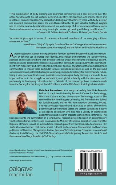 "This examination of body piercing and anarchist communities is a tour de force over the academic discourse on sub-cultural networks, identity construction, and maintenance and resistance. Lisa's lengthy association, lasting more than fifteen years, with body piercing and anarchist communities across the world has enabled her to gain valuable firsthand insights and to provide nuanced explanations rooted in a wide range of diverse conceptual frameworks that are seldom used so interactively in a single manuscript dealing with body modification." - Dawood H. Sultan, Assistant Professor, University of South Florida