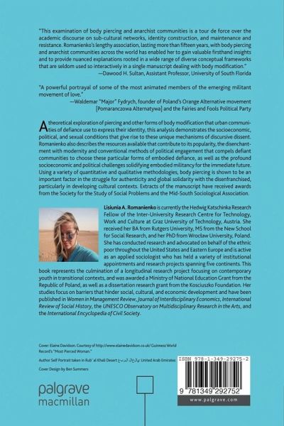 "This examination of body piercing and anarchist communities is a tour de force over the academic discourse on sub-cultural networks, identity construction, and maintenance and resistance. Lisa's lengthy association, lasting more than fifteen years, with body piercing and anarchist communities across the world has enabled her to gain valuable firsthand insights and to provide nuanced explanations rooted in a wide range of diverse conceptual frameworks that are seldom used so interactively in a single manuscript dealing with body modification." - Dawood H. Sultan, Assistant Professor, University of South Florida